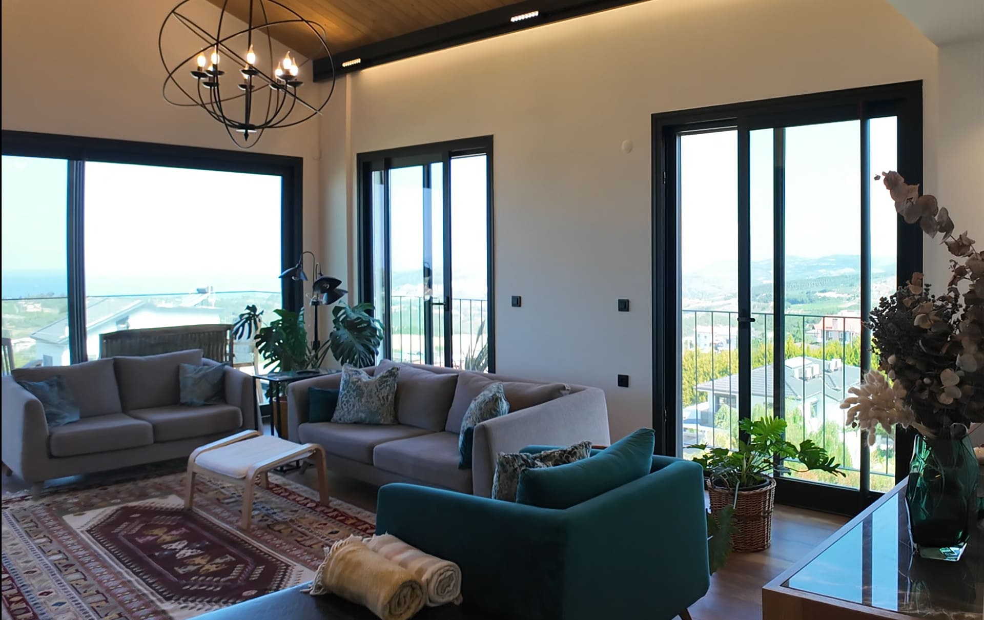 Villanın iç tasarımı, geniş ve ferah yaşam alanlarıyla aileler ya da geniş misafir grupları için ideal bir ortam yaratıyor. Beş yatak odası ve bir yaşam odası ile donatılmış bu villa, konforlu bir konaklama deneyimi sunarken, her detayda özenle düşünülmüş bir estetik anlayışını yansıtıyor. Büyük pencereler ve geniş cam kapılar, doğal ışığı içeri davet ederken, Samos Adası‘nın panoramik manzarasını da kesintisiz bir şekilde sunuyor. Projenin cazibesini tamamlayan bir teras ve bahçe alanıyla mükemmel bir ortam sağlıyor.